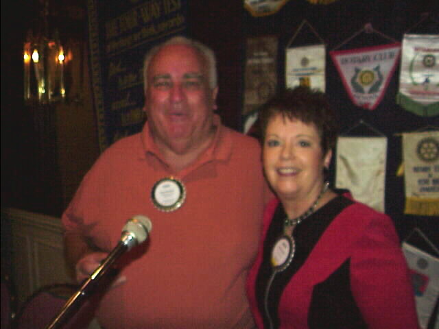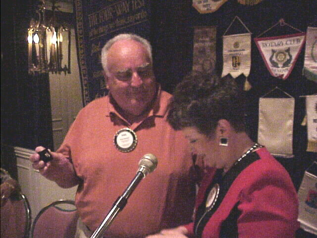 To end the old year, new president, Angie Hassler presents the Past President's pin and a plaque to outgoing President, Paul Venezio.