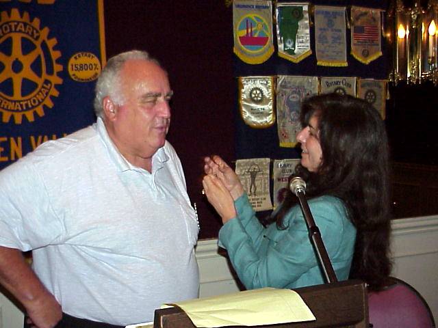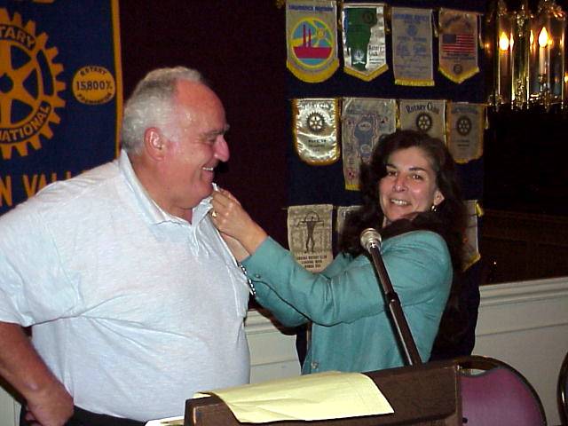 To start the 1999-2000 year off right, our new President Paul Venezio was presented the president's pin from the outgoing President, Joanne Bengiveno. Joanne looks very proud (probably happy to pass the baton).
